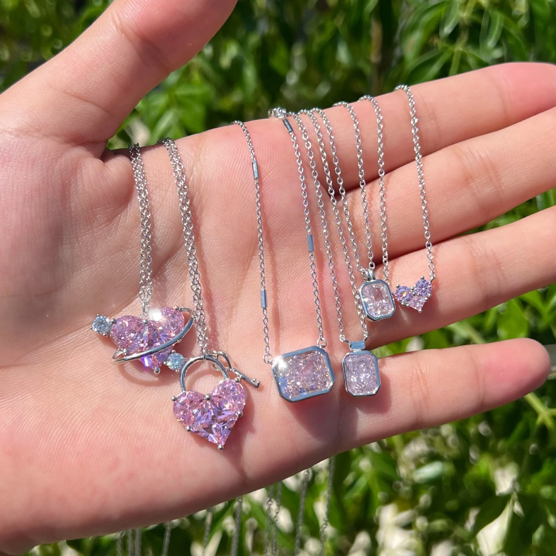 Beautiful Pink CZ Heart Geometry 925 Sterling Silver Necklace