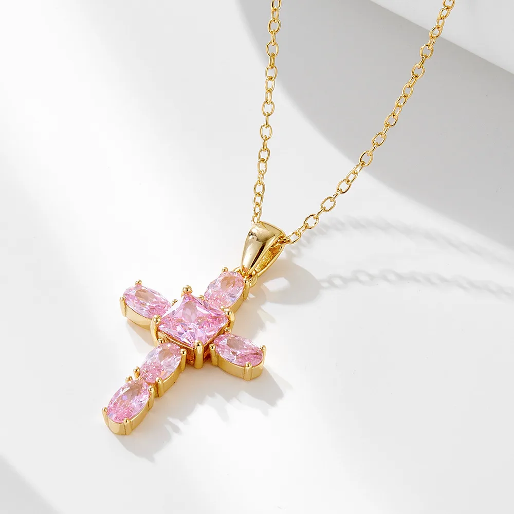 Girl Beautiful Emerald Pink CZ Cross 925 Sterling Silver Necklace