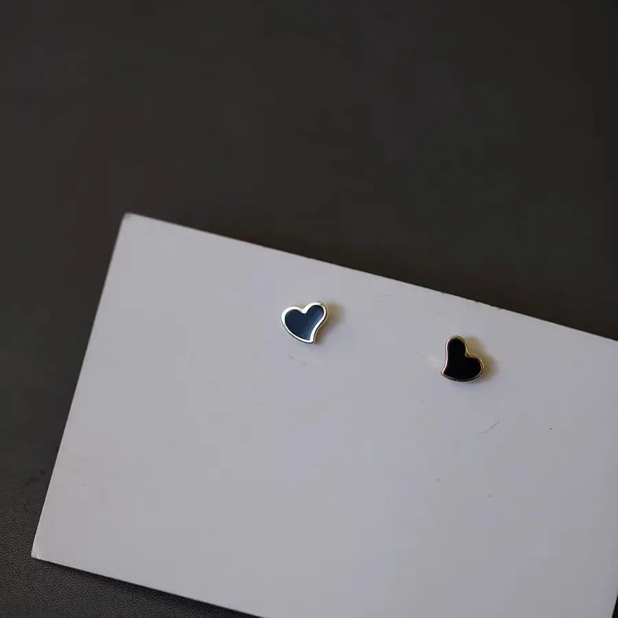 S999 pure silver plated 16K gold black enamel heart-shaped earrings, niche desig