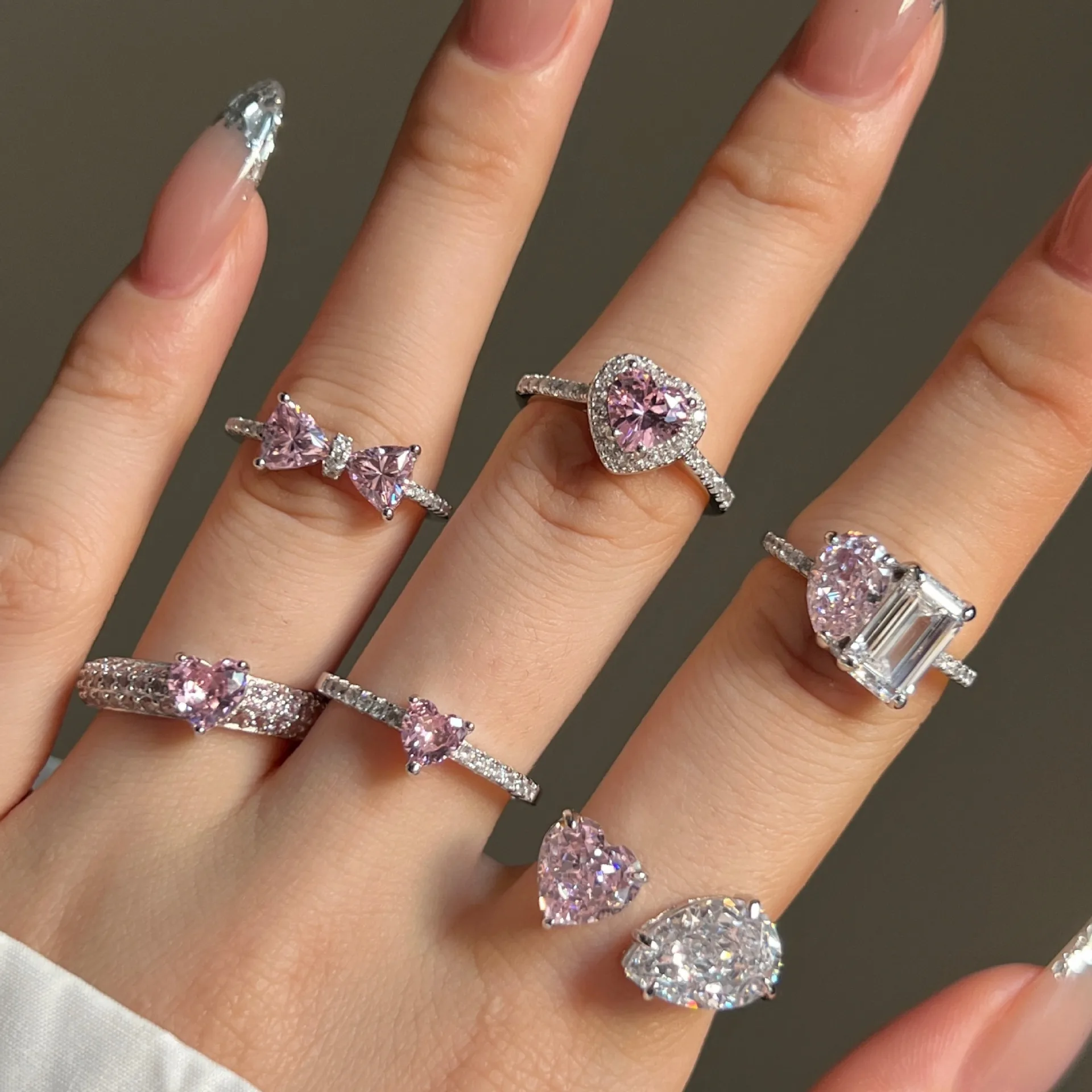 Wedding Pink 8A Cubic Zirconia Heart Bow-Knot 925 Sterling Silver Adjustable Rin