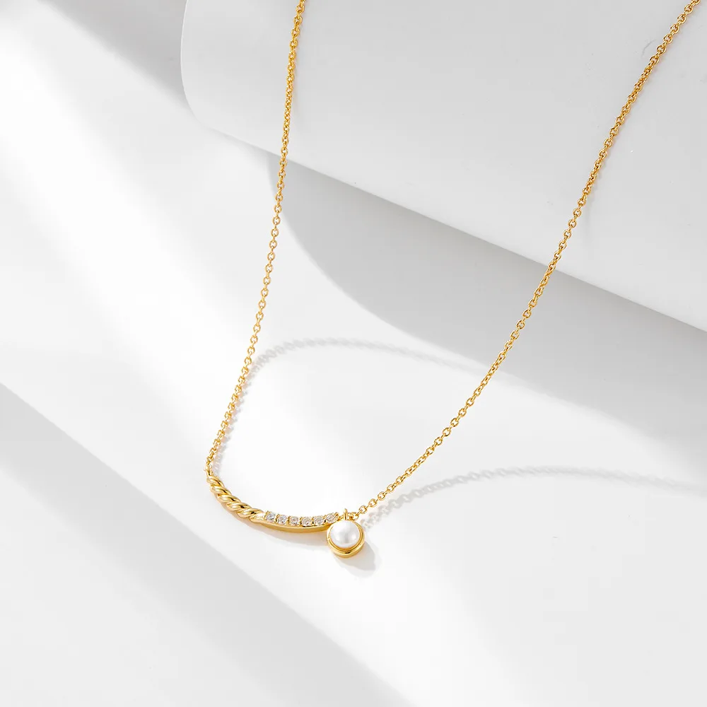 Women Fashion Natural Round Pearl Twisted Chain CZ Smile 925 Sterling Silver Nec